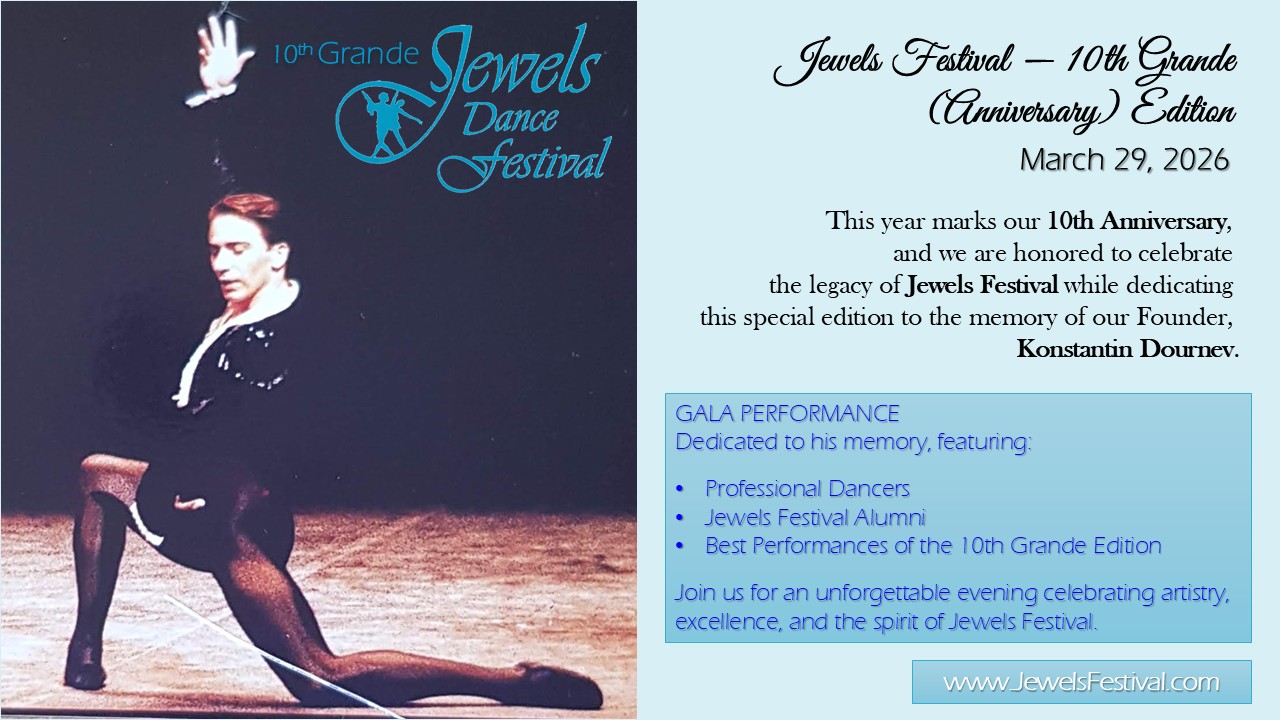 The Gala Performance will honor Konstantin with featured professional dancers, Jewels Festival alumni, and the best performances from the 10th Grande Edition.